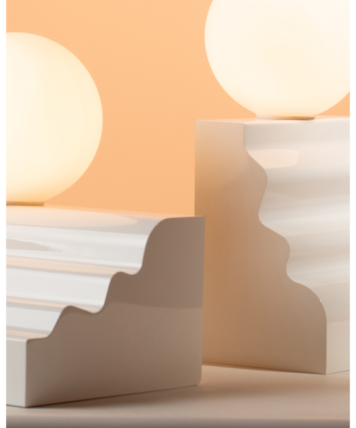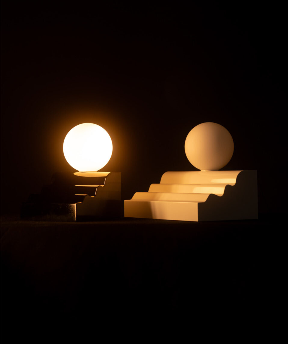 Les Dé-Moulures s’inscrivent dans l’ancrage parisien de José Lévy et son héritage haussmannien. Dans un travail de « déconstruction » de ce style iconique, le designer a détourné le motif ornemental des moulures intérieures pour sculpter la base de ces appliques ou lampes à poser. En apposant une tête en verre opale à ce pied architectural, le designer amplifie le charisme de ces lampes qui reprennent l’idée de forme habitée.