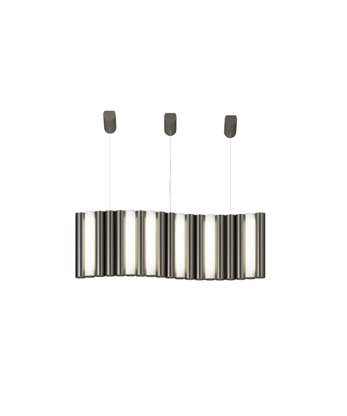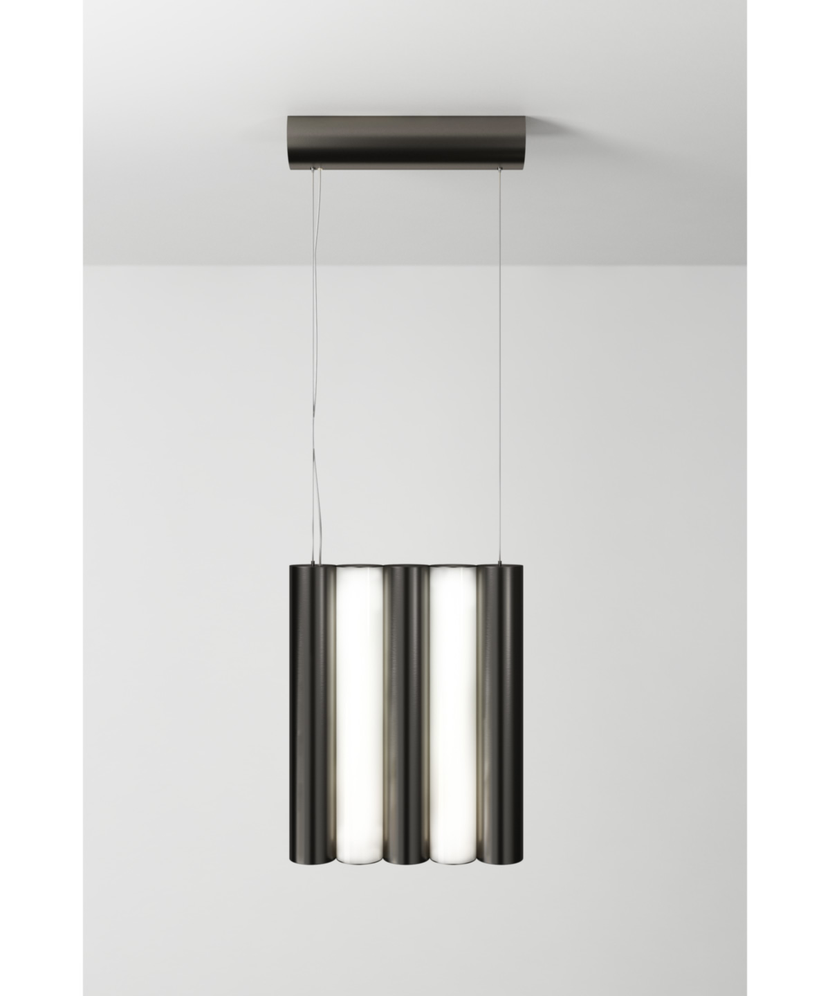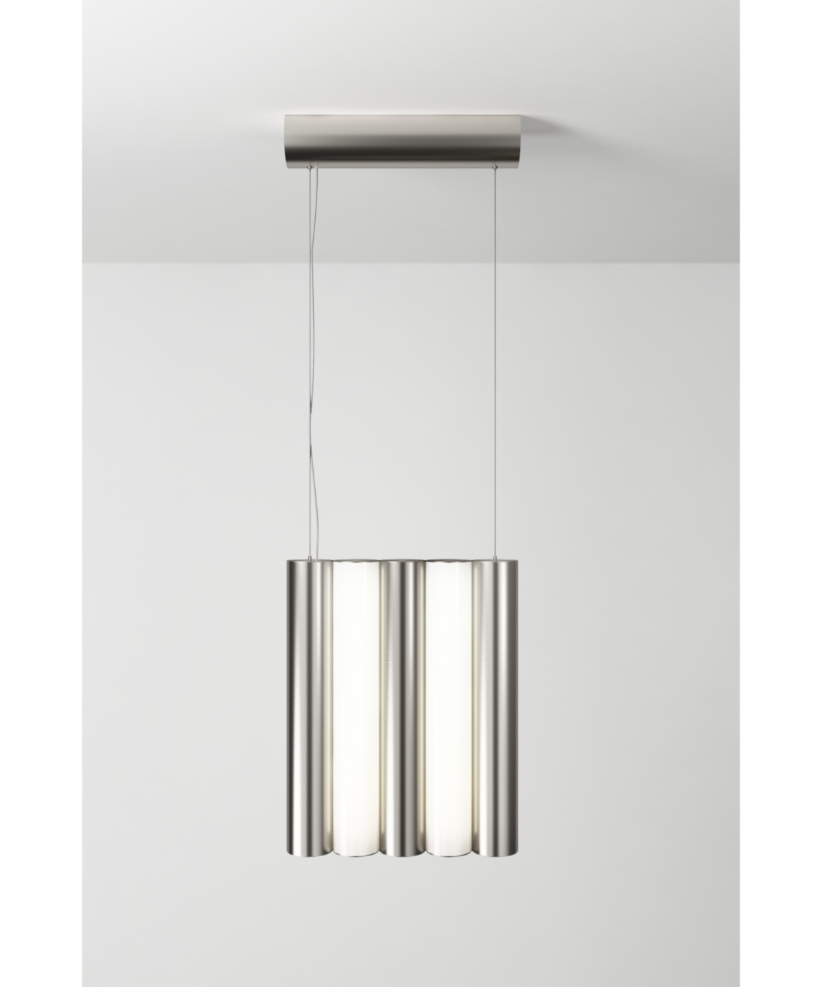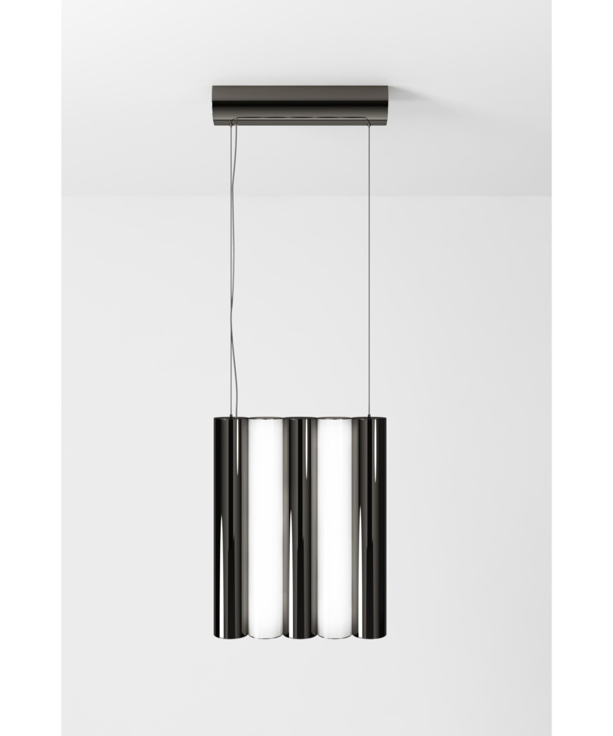 C’est à partir de tubes métalliques et de cylindres blancs opalins, multipliés, que s’agence ainsi toute une gamme de luminaires