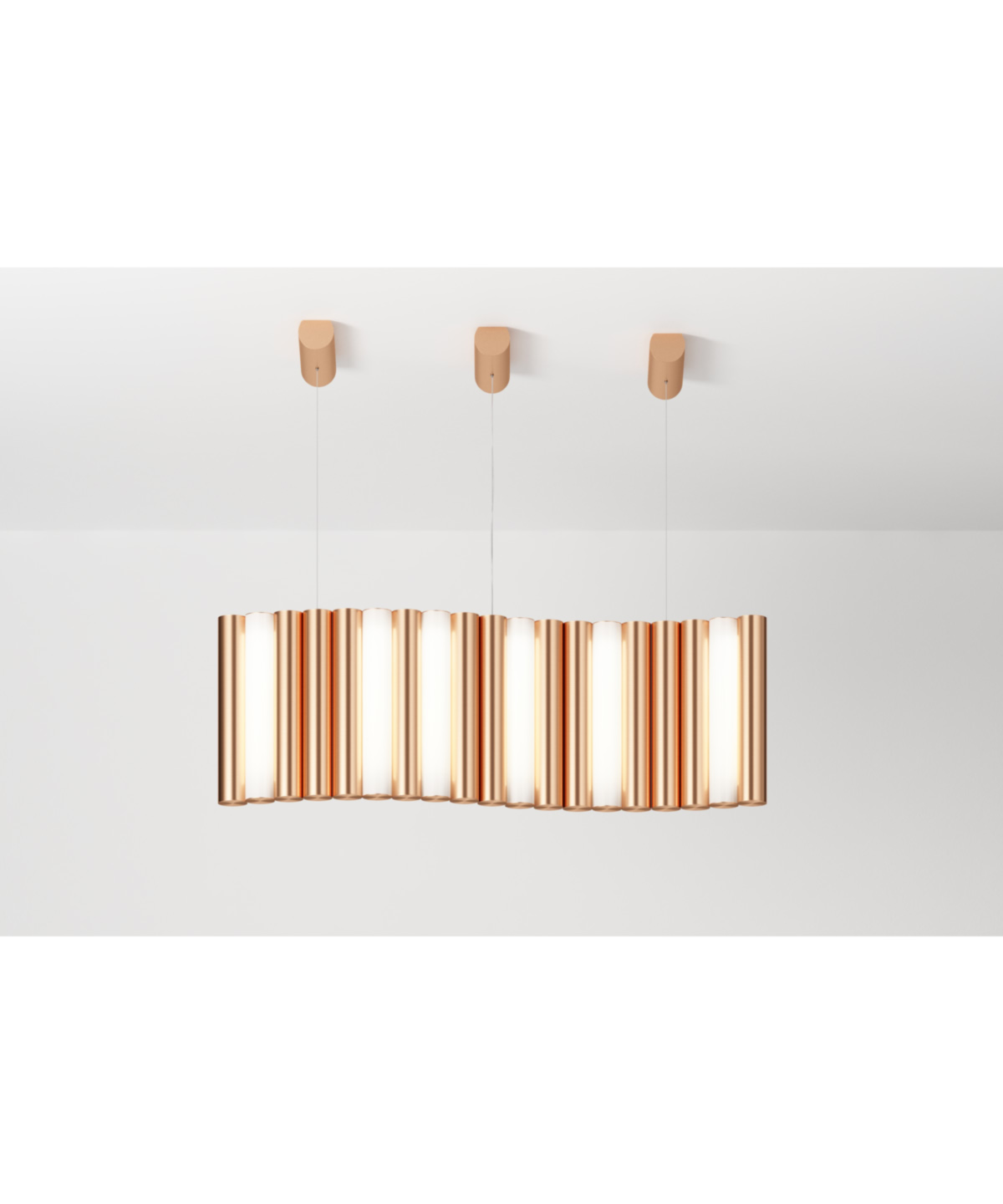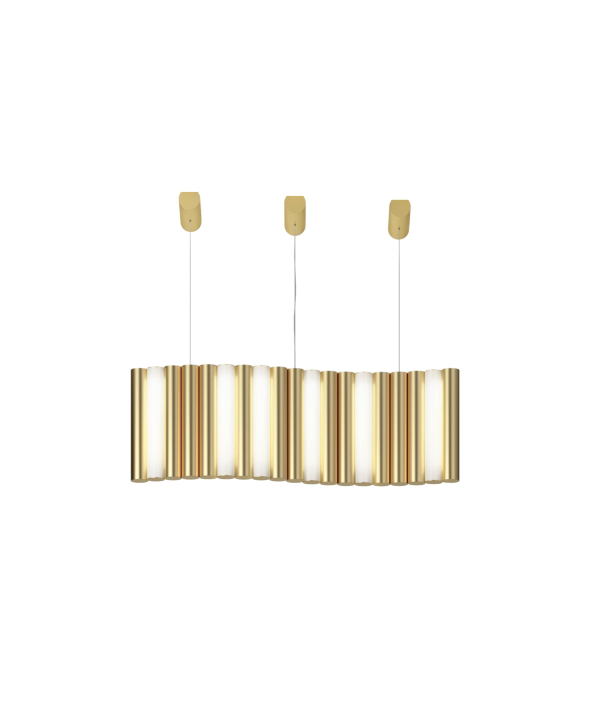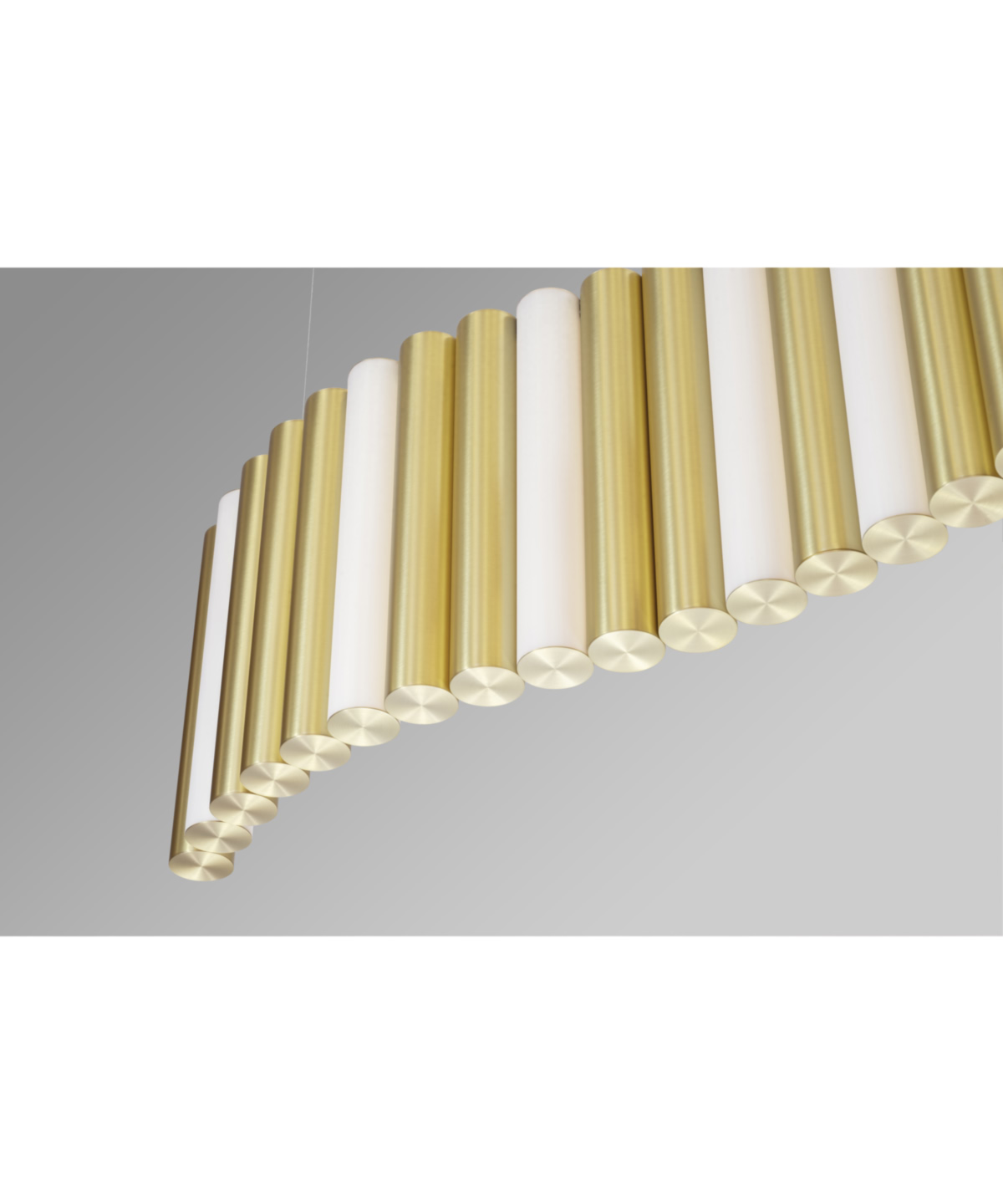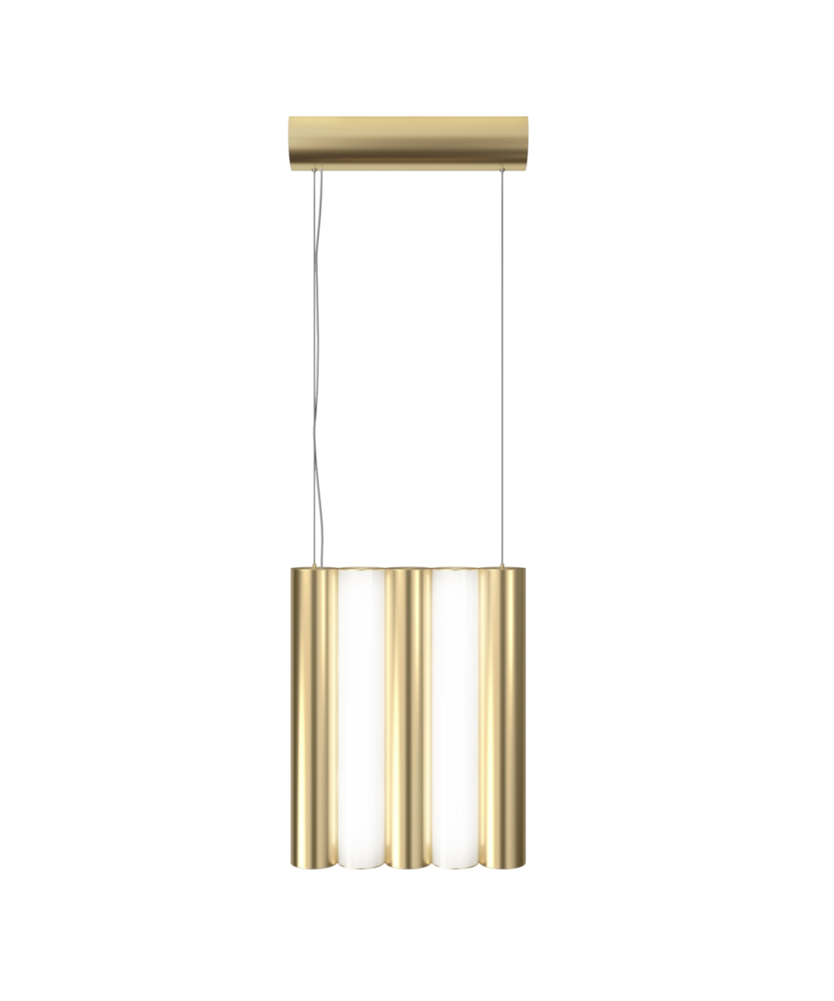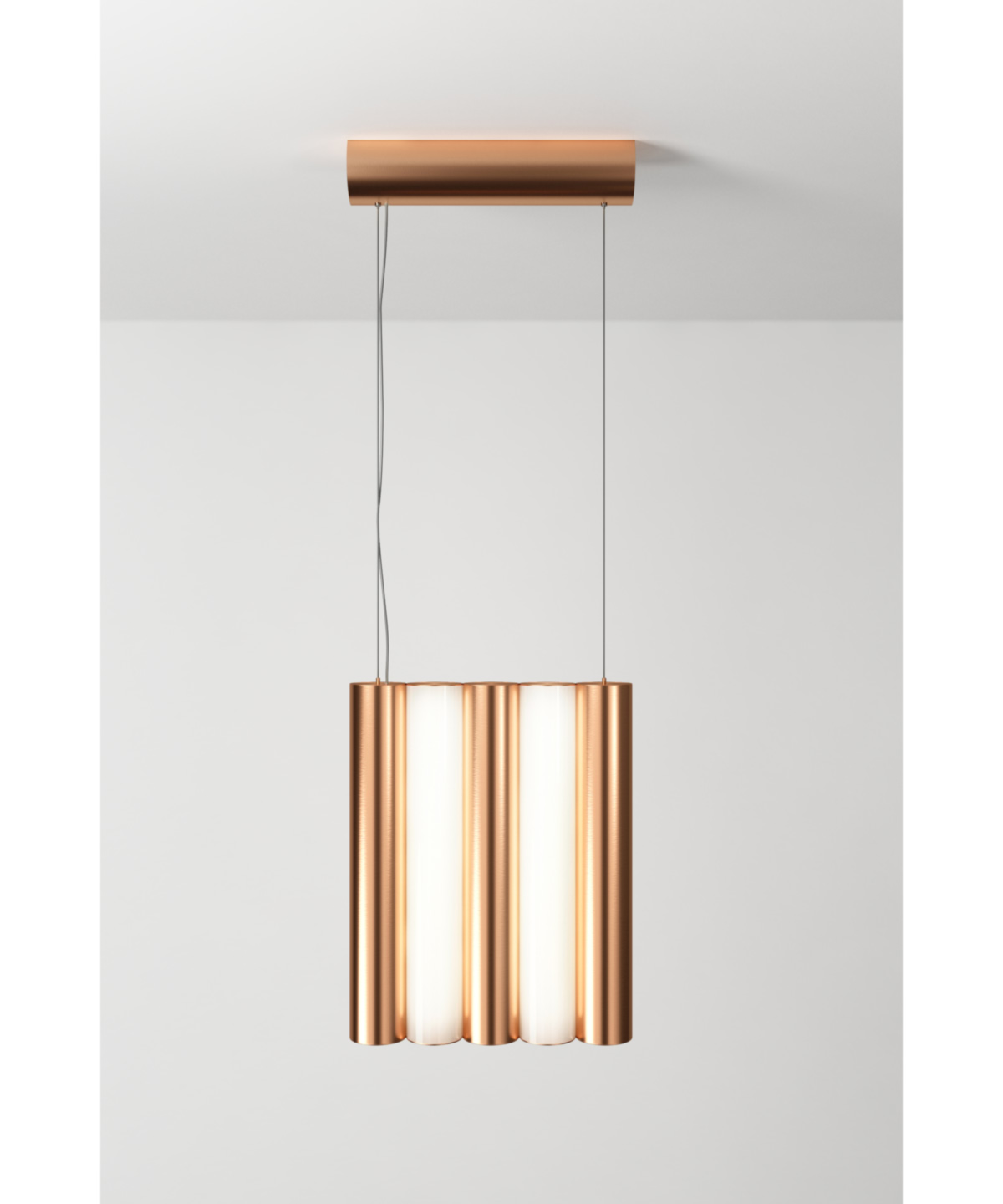C’est à partir de tubes métalliques et de cylindres blancs opalins, multipliés, que s’agence ainsi toute une gamme de luminaires