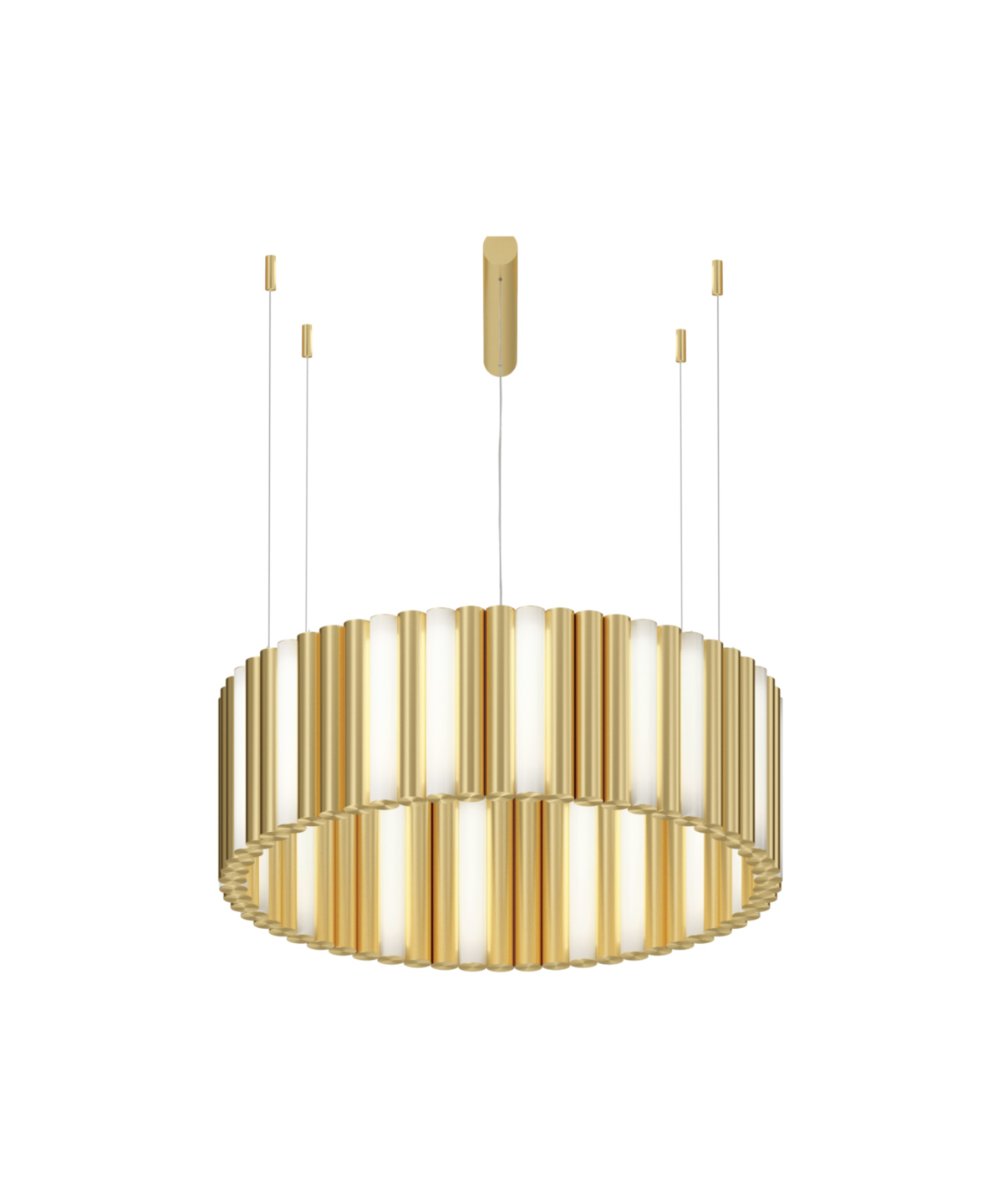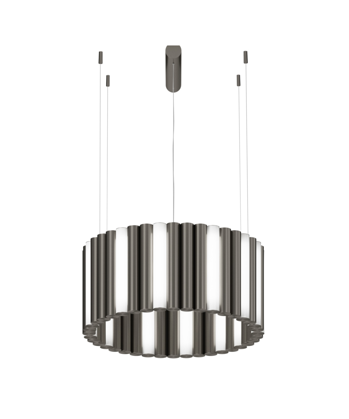 C’est à partir de tubes métalliques et de cylindres blancs opalins, multipliés, que s’agence ainsi toute une gamme de luminaires