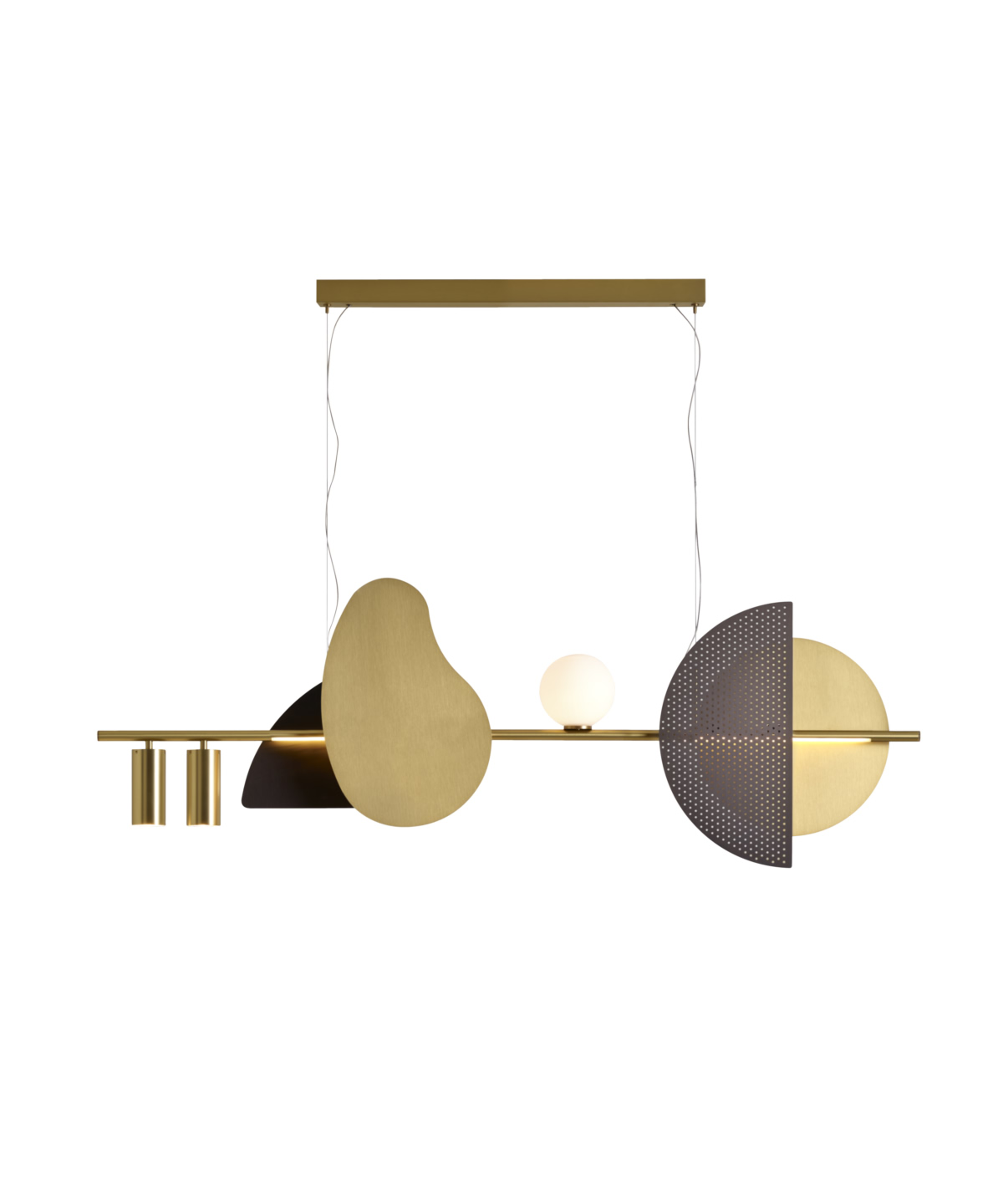 Inspiré de peintures, et tout droit sorti du langage graphique imaginaire de Sylvain Willenz, NACHO rassemble sur une même ligne divers éléments sculpturaux et lumineux.